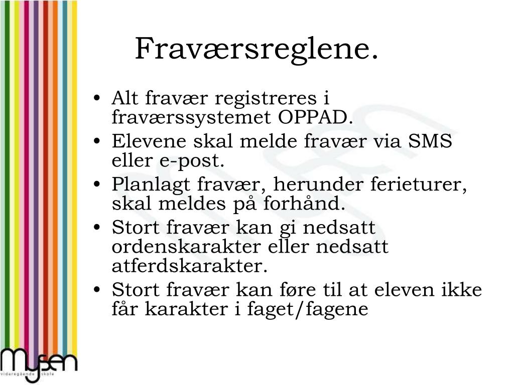 Fraværsreglene. • Alt fravær registreres i fraværssystemet OPPAD. • Elevene skal melde fravær via SMS eller e-post. • Planlagt fravær, herunder ferieturer, skal meldes på forhånd. • Stort fravær kan gi nedsatt ordenskarakter eller nedsatt atferdskarakter. • Stort fravær kan føre til at eleven ikke får karakter i faget/fagene