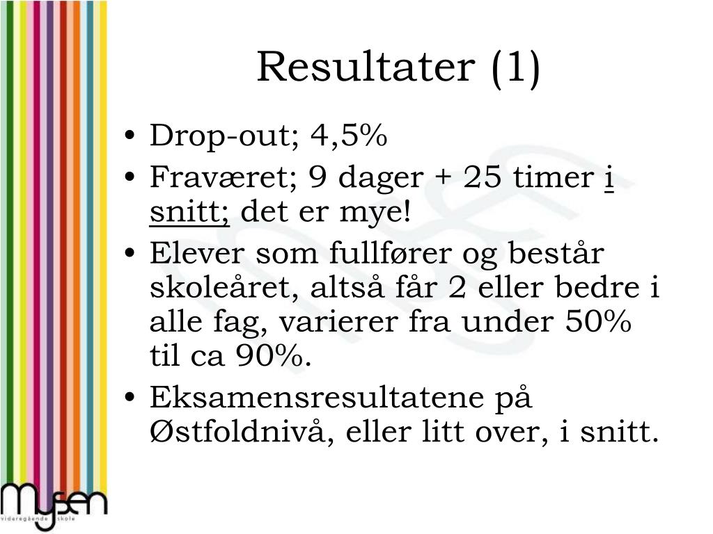 Resultater (1) • Drop-out; 4,5% • Fraværet; 9 dager + 25 timer i snitt; det er mye! • Elever som fullfører og består skoleåret, altså får 2 eller bedre i alle fag, varierer fra under 50% til ca 90%. • Eksamensresultatene på Østfoldnivå, eller litt over, i snitt.
