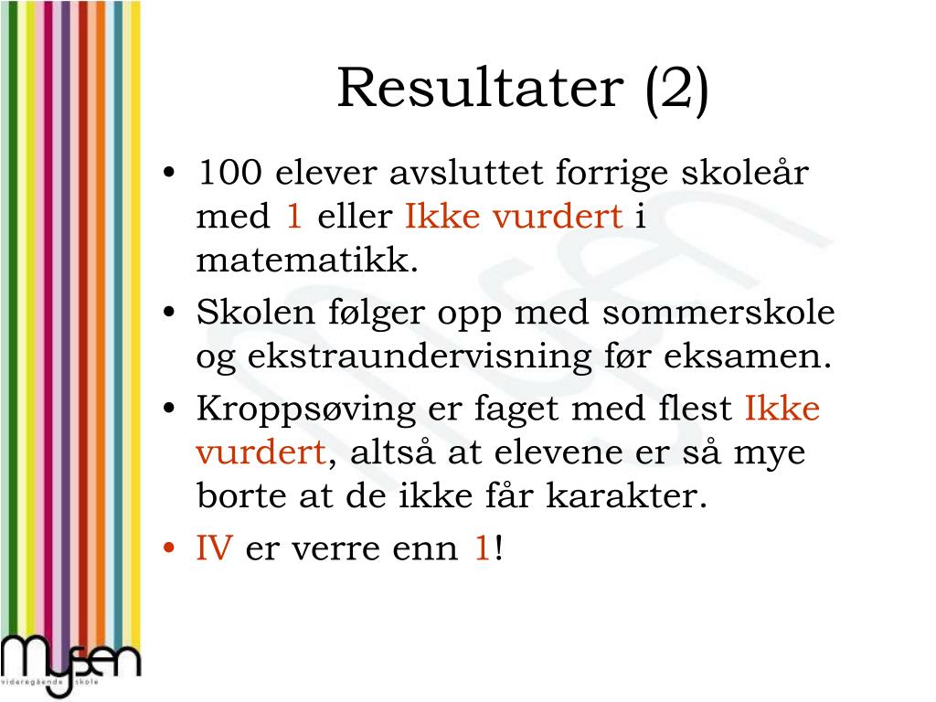 Resultater (2) • 100 elever avsluttet forrige skoleår med 1 eller Ikke vurdert i matematikk. • Skolen følger opp med sommerskole og ekstraundervisning før eksamen. • Kroppsøving er faget med flest Ikke vurdert, altså at elevene er så mye borte at de ikke får karakter. • IV er verre enn 1!
