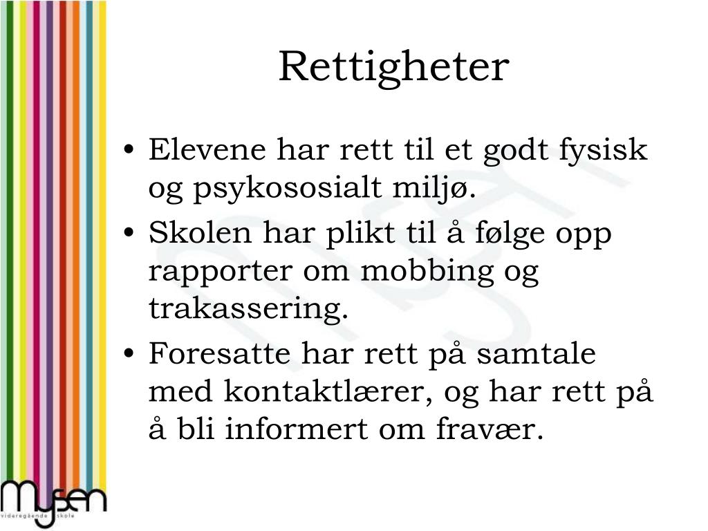 Rettigheter • Elevene har rett til et godt fysisk og psykososialt miljø. • Skolen har plikt til å følge opp rapporter om mobbing og trakassering. • Foresatte har rett på samtale med kontaktlærer, og har rett på å bli informert om fravær.