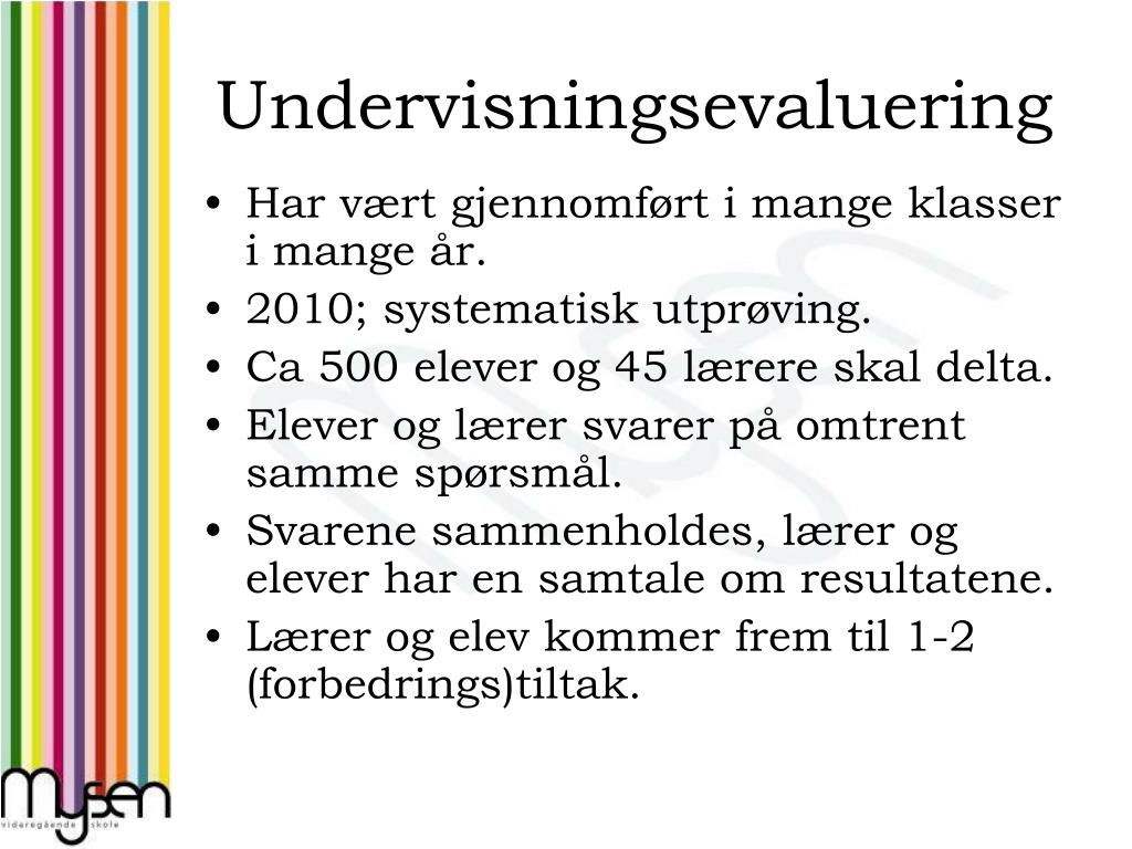 Undervisningsevaluering • Har vært gjennomført i mange klasser i mange år. • 2010; systematisk utprøving. • Ca 500 elever og 45 lærere skal delta. • Elever og lærer svarer på omtrent samme spørsmål. • Svarene sammenholdes, lærer og elever har en samtale om resultatene. • Lærer og elev kommer frem til 1-2 (forbedrings)tiltak.