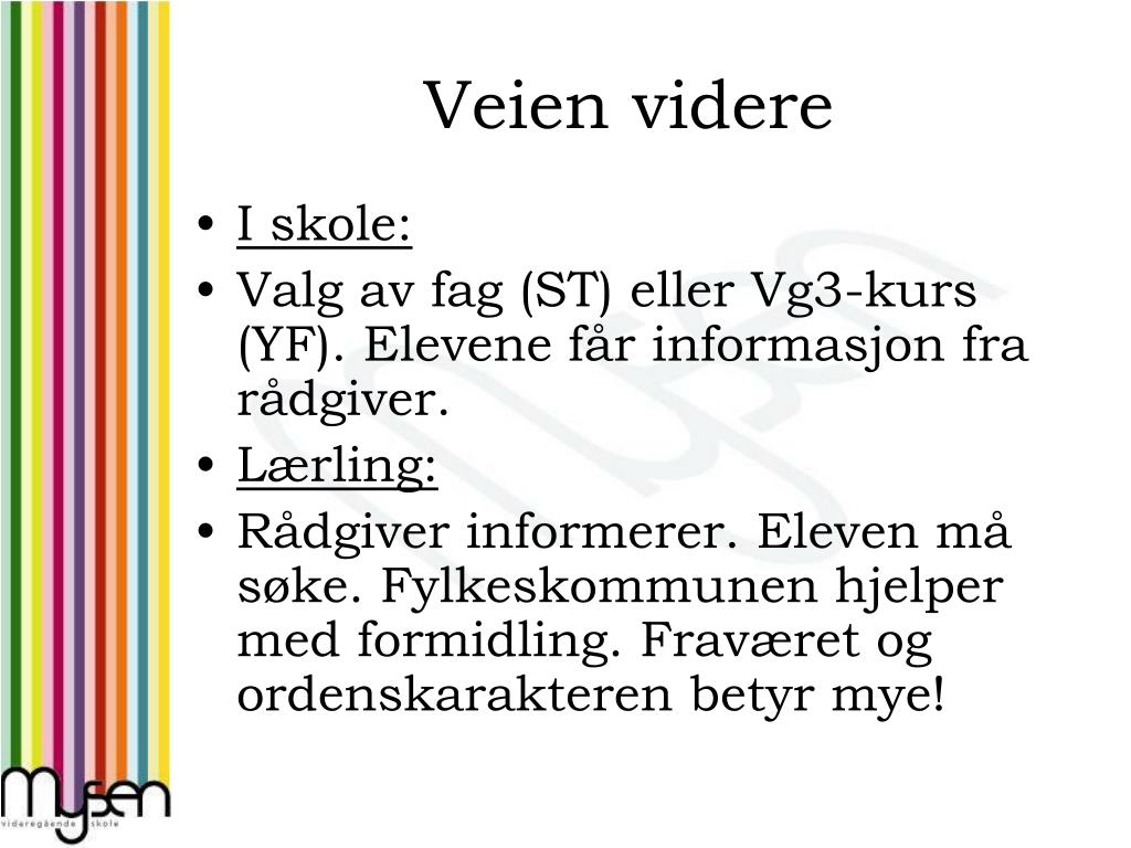 Veien videre • I skole: • Valg av fag (ST) eller Vg3-kurs (YF). Elevene får informasjon fra rådgiver. • Lærling: • Rådgiver informerer. Eleven må søke. Fylkeskommunen hjelper med formidling. Fraværet og ordenskarakteren betyr mye!