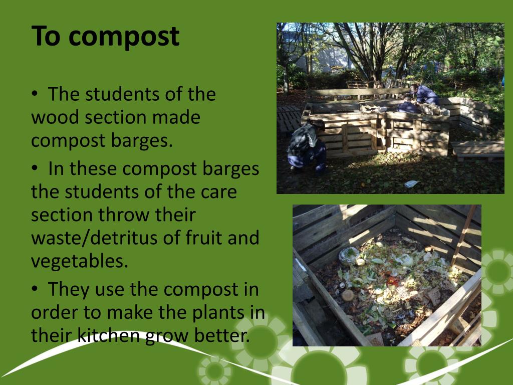 To compost The students of the wood section made compost barges. In these compost barges the students of the care section throw their waste/detritus of fruit and vegetables. They use the compost in order to make the plants in their kitchen grow better.