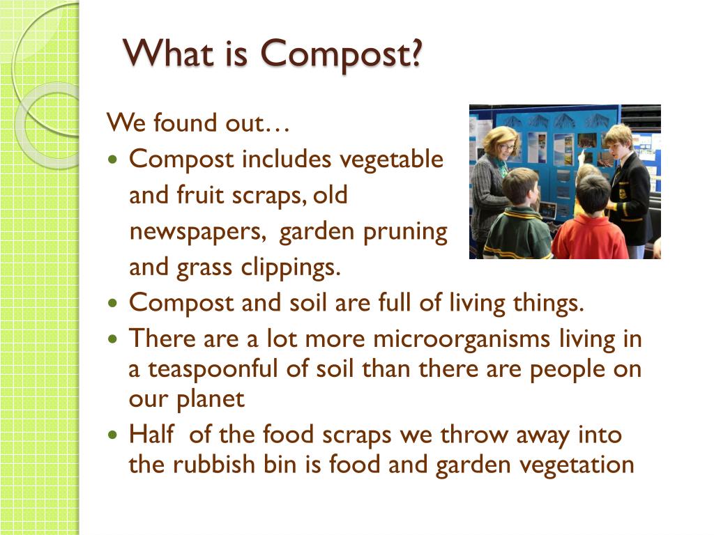 What is Compost? We found out… • Compost includes vegetable and fruit scraps, old newspapers, garden pruning and grass clippings. • Compost and soil are full of living things. • There are a lot more microorganisms living in a teaspoonful of soil than there are people on our planet • Half of the food scraps we throw away into the rubbish bin is food and garden vegetation