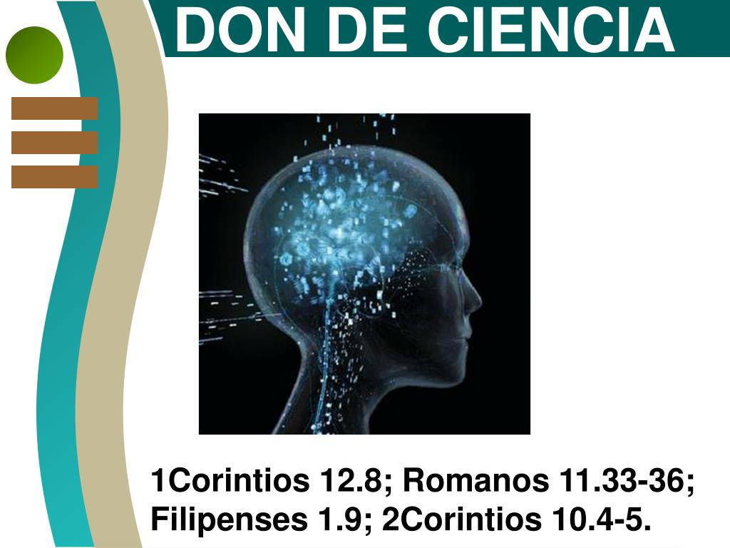 DON DE CIENCIA. 1Corintios 12.8; Romanos 11.33-36; Filipenses 1.9; 2Corintios 10.4-5. VERDAD BÍBLICA. El Don de ciencia es concedido por el Espíritu Santo. VERDAD BÍBLICA APLICADA. El Don de Ciencia es una dádiva del Espíritu Santo que Él concede para beneficio y crecimiento de la iglesia.