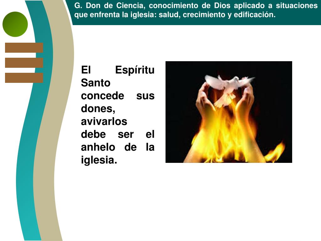 G. Don de Ciencia, conocimiento de Dios aplicado a situaciones que enfrenta la iglesia: salud, crecimiento y edificación. El Espíritu Santo concede sus dones, avivarlos debe ser el anhelo de la iglesia.