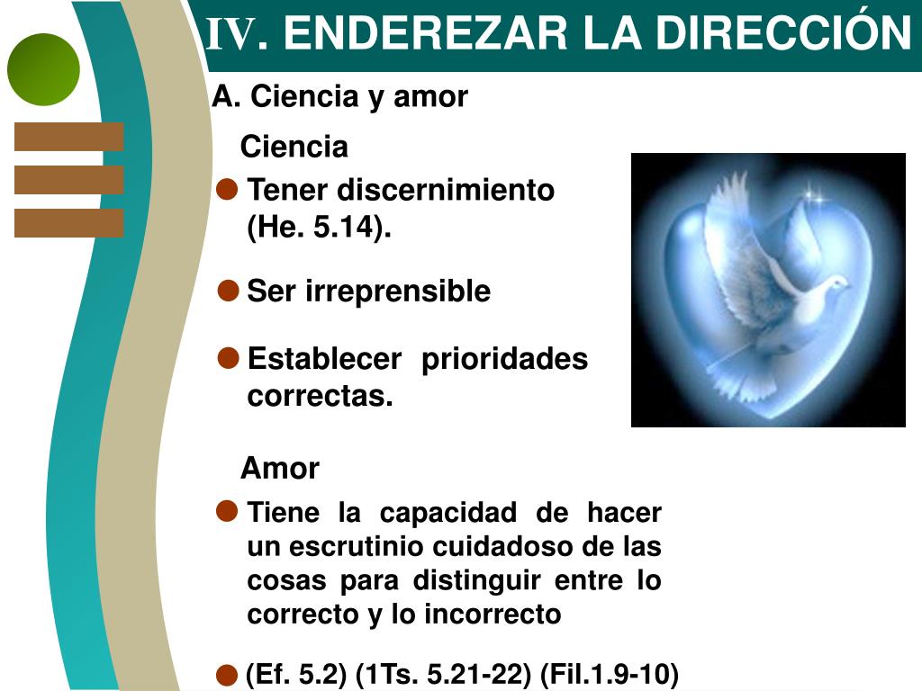 IV. ENDEREZAR LA DIRECCIÓN A. Ciencia y amor Ciencia Tener discernimiento (He. 5.14). Ser irreprensible Establecer prioridades correctas. Amor Tiene la capacidad de hacer un escrutinio cuidadoso de las cosas para distinguir entre lo correcto y lo incorrecto (Ef. 5.2) (1Ts. 5.21-22) (Fil.1.9-10)