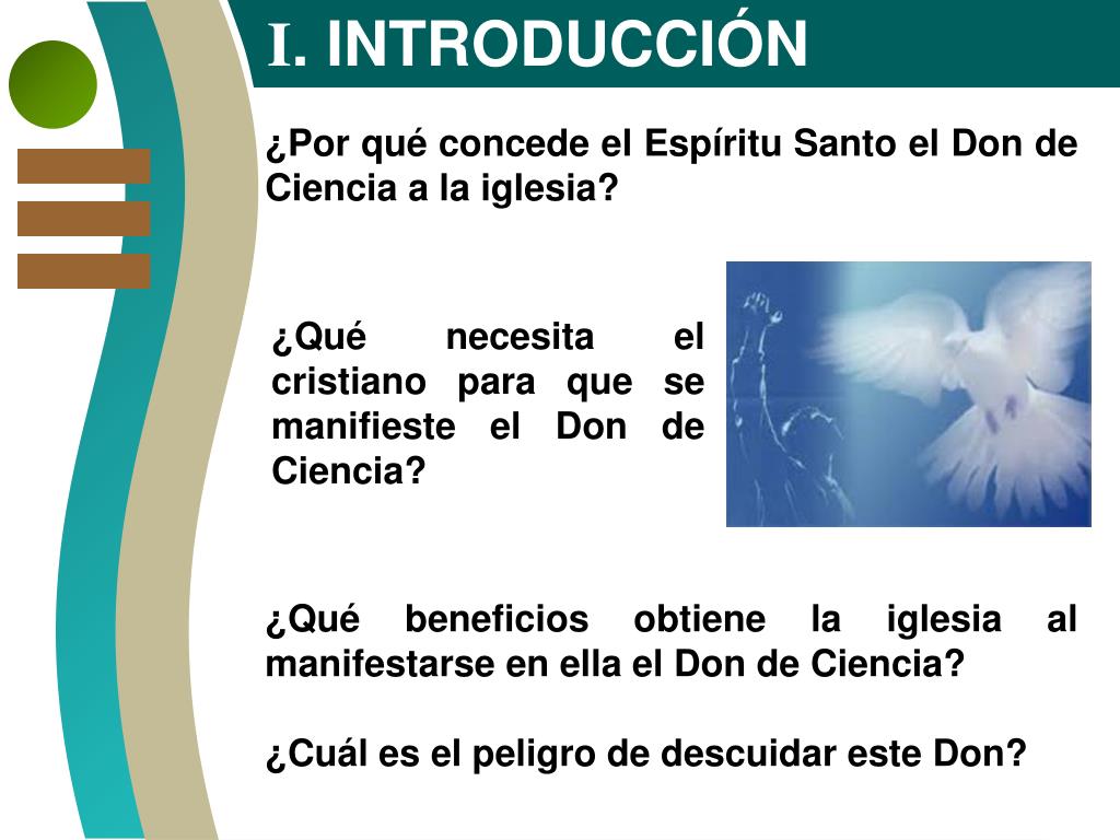 I. INTRODUCCIÓN ¿Por qué concede el Espíritu Santo el Don de Ciencia a la iglesia? ¿Qué necesita el cristiano para que se manifieste el Don de Ciencia? ¿Qué beneficios obtiene la iglesia al manifestarse en ella el Don de Ciencia? ¿Cuál es el peligro de descuidar este Don?