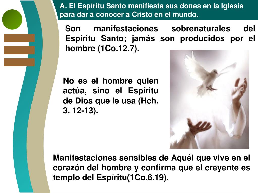 A. El Espíritu Santo manifiesta sus dones en la Iglesia para dar a conocer a Cristo en el mundo. Son manifestaciones sobrenaturales del Espíritu Santo; jamás son producidos por el hombre (1Co.12.7). No es el hombre quien actúa, sino el Espíritu de Dios que le usa (Hch. 3. 12-13). Manifestaciones sensibles de Aquél que vive en el corazón del hombre y confirma que el creyente es templo del Espíritu(1Co.6.19).