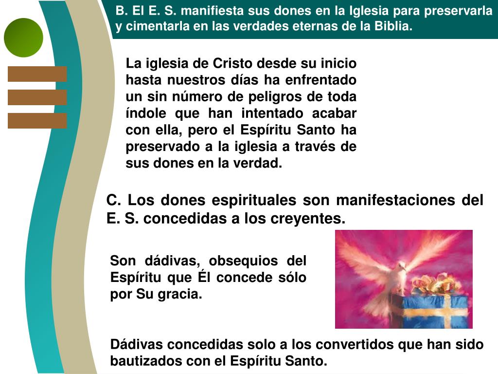 B. El E. S. manifiesta sus dones en la Iglesia para preservarla y cimentarla en las verdades eternas de la Biblia. La iglesia de Cristo desde su inicio hasta nuestros días ha enfrentado un sin número de peligros de toda índole que han intentado acabar con ella, pero el Espíritu Santo ha preservado a la iglesia a través de sus dones en la verdad. C. Los dones espirituales son manifestaciones del E. S. concedidas a los creyentes. Son dádivas, obsequios del Espíritu que Él concede sólo por Su gracia. Dádivas concedidas solo a los convertidos que han sido bautizados con el Espíritu Santo.