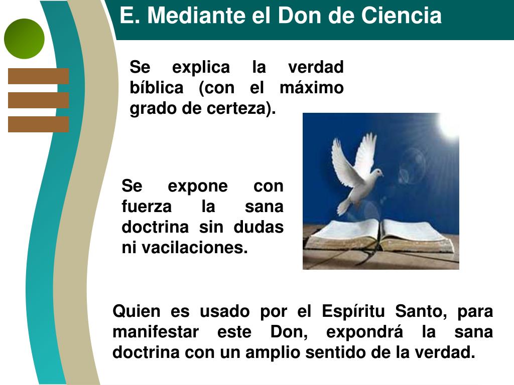 E. Mediante el Don de Ciencia Se explica la verdad bíblica (con el máximo grado de certeza). Se expone con fuerza la sana doctrina sin dudas ni vacilaciones. Quien es usado por el Espíritu Santo, para manifestar este Don, expondrá la sana doctrina con un amplio sentido de la verdad.