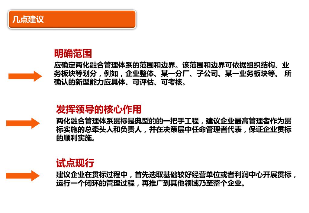 几点建议 明确范围 应确定两化融合管理体系的范围和边界。该范围和边界可依据组织结构、业务板块等划分,例如,企业整体、某一分厂、子公司、某一业务板块等。 所确认的新型能力应具体、可评估、可考核。 发挥领导的核心作用 两化融合管理体系贯标是典型的的一把手工程,建议企业最高管理者作为贯标实施的总牵头人和负责人,并在决策层中任命管理者代表,保证企业贯标的顺利实施。 试点现行 建议企业在贯标过程中,首先选取基础较好经营单位或者利润中心开展贯标,运行一个闭环的管理过程,再推广到其他领域乃至整个企业。