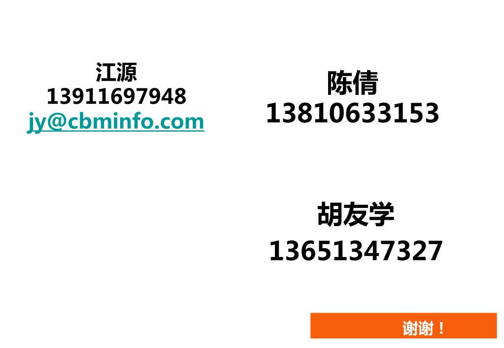 江源 13911697948 jy@cbminfo.com 陈倩 13810633153 胡友学 13651347327 谢谢!