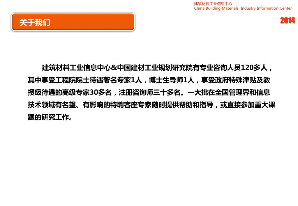 建筑材料工业信息中心 China Building Materials Industry Information Center 2014 • 关于我们 • 建筑材料工业信息中心&中国建材工业规划研究院有专业咨询人员120多人,其中享受工程院院士待遇著名专家1人,博士生导师1人,享受政府特殊津贴及教授级待遇的高级专家30多名,注册咨询师三十多名。一大批在全国管理界和信息技术领域有名望、有影响的特聘客座专家随时提供帮助和指导,或直接参加重大课题的研究工作。