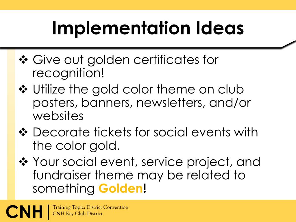 Implementation Ideas • Give out golden certificates for recognition! • Utilize the gold color theme on club posters, banners, newsletters, and/or websites • Decorate tickets for social events with the color gold. • Your social event, service project, and fundraiser theme may be related to something Golden!