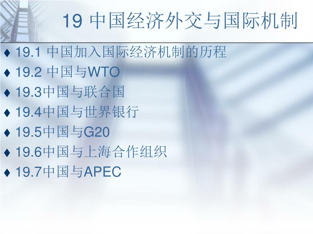19 中国经济外交与国际机制 • 19.1 中国加入国际经济机制的历程 • 19.2 中国与WTO • 19.3中国与联合国 • 19.4中国与世界银行 • 19.5中国与G20 • 19.6中国与上海合作组织 • 19.7中国与APEC