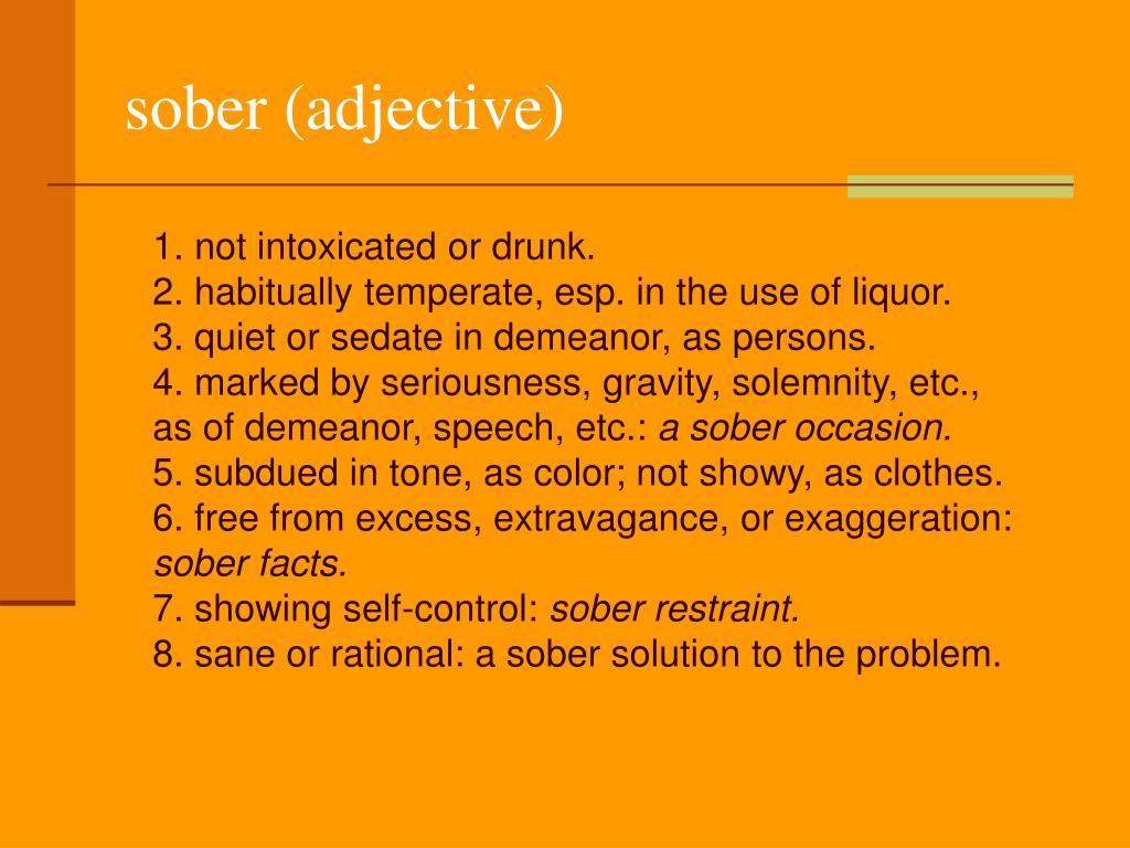 sober (adjective) 1. not intoxicated or drunk. 2. habitually temperate, esp. in the use of liquor. 3. quiet or sedate in demeanor, as persons. 4. marked by seriousness, gravity, solemnity, etc., as of demeanor, speech, etc.: a sober occasion. 5. subdued in tone, as color; not showy, as clothes. 6. free from excess, extravagance, or exaggeration: sober facts. 7. showing self-control: sober restraint. 8. sane or rational: a sober solution to the problem.