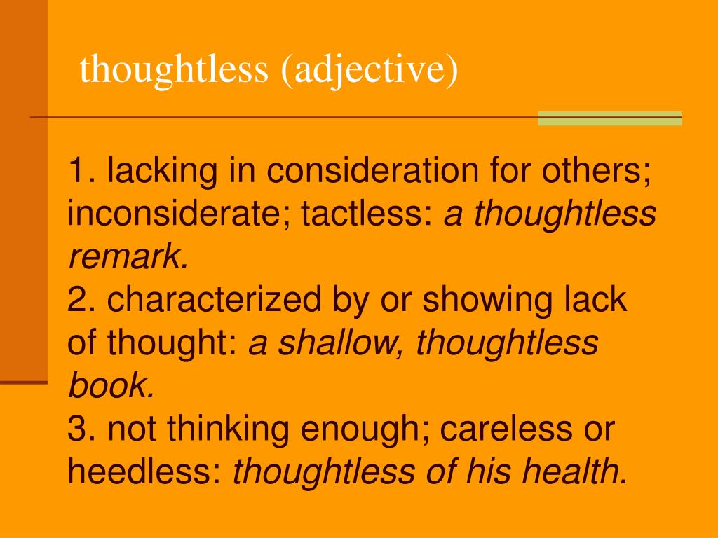 thoughtless (adjective) 1. lacking in consideration for others; inconsiderate; tactless: a thoughtless remark. 2. characterized by or showing lack of thought: a shallow, thoughtless book. 3. not thinking enough; careless or heedless: thoughtless of his health.