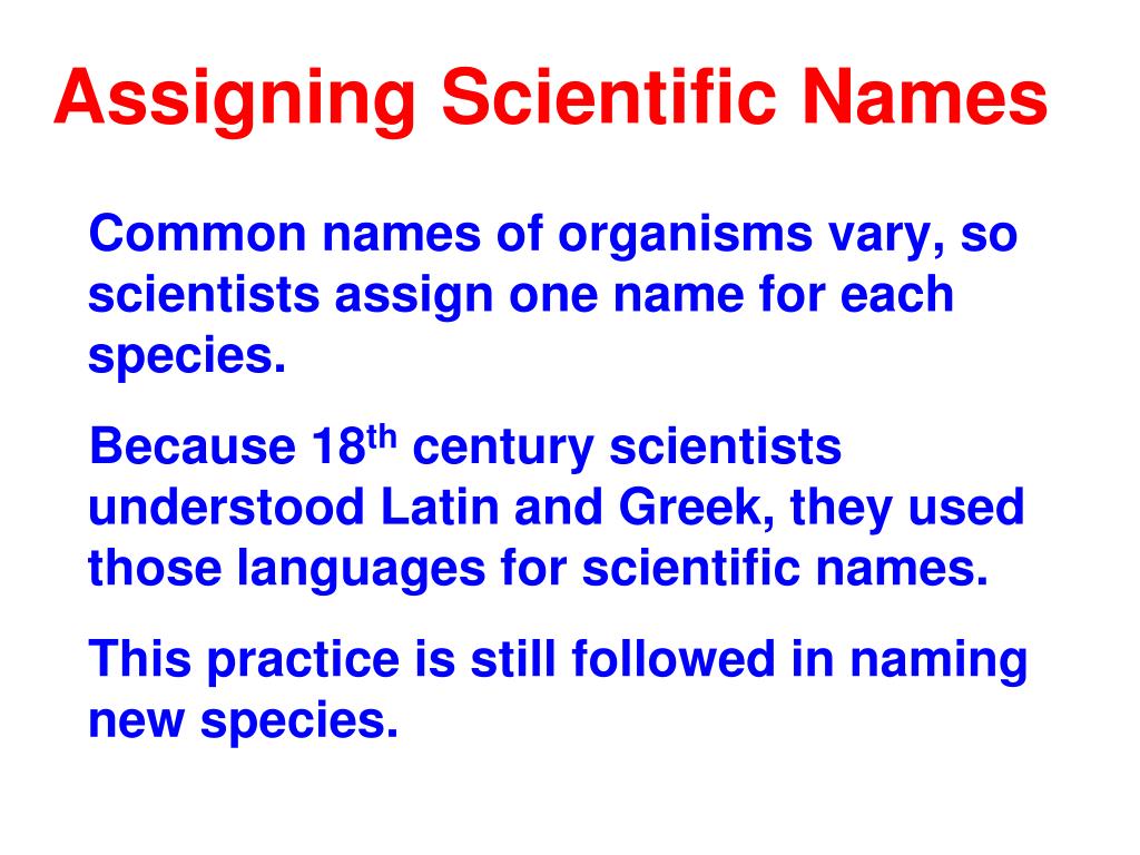 Assigning Scientific Names • Common names of organisms vary, so scientists assign one name for each species. • Because 18th century scientists understood Latin and Greek, they used those languages for scientific names. • This practice is still followed in naming new species.
