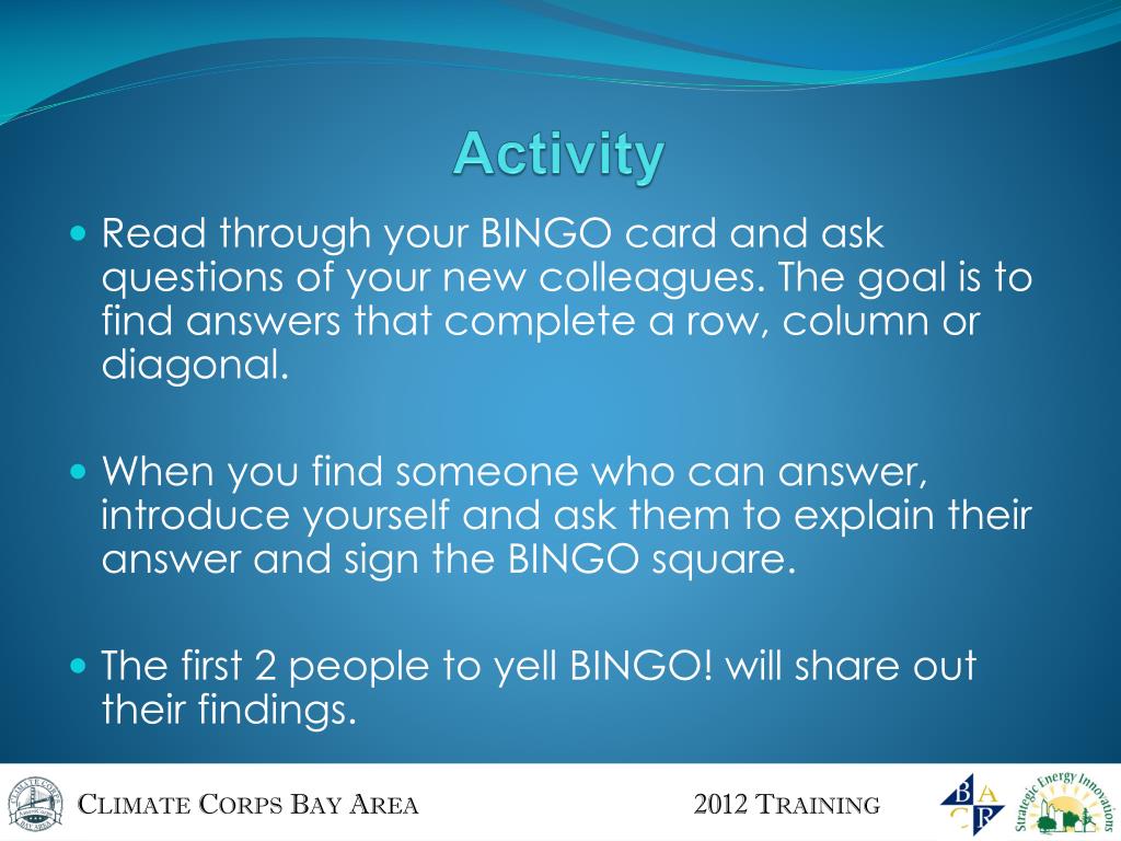 Climate Corps Bay Area 2012 Training. Day 1. Logistics. Opening Address. Cyane Dandridge Executive Director Strategic Energy innovations Adolfo Rivera Director of national Service Bay Area Community Resources. Introductions. Staff Introductions. Bay Area Community Resources (BACR)