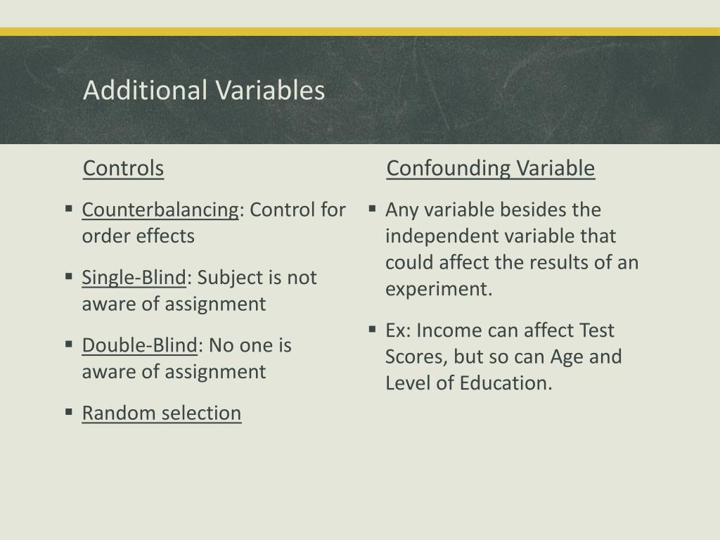 Additional Variables Controls Confounding Variable Any variable besides the independent variable that could affect the results of an experiment. Ex: Income can affect Test Scores, but so can Age and Level of Education. • Counterbalancing: Control for order effects • Single-Blind: Subject is not aware of assignment • Double-Blind: No one is aware of assignment • Random selection