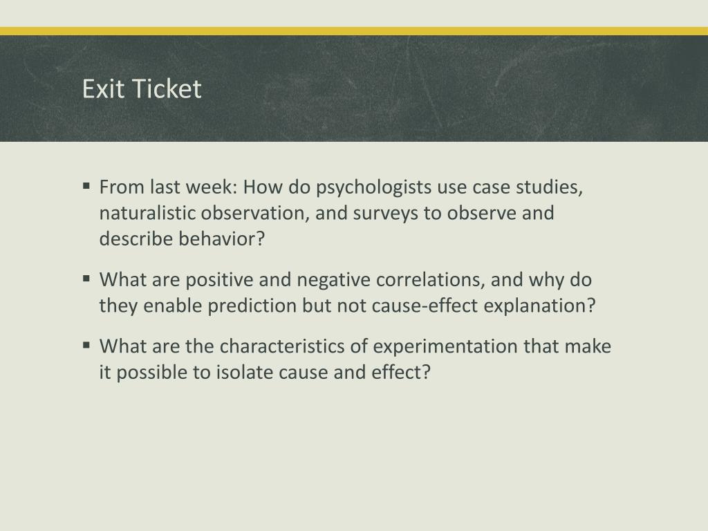 Exit Ticket • From last week: How do psychologists use case studies, naturalistic observation, and surveys to observe and describe behavior? • What are positive and negative correlations, and why do they enable prediction but not cause-effect explanation? • What are the characteristics of experimentation that make it possible to isolate cause and effect?
