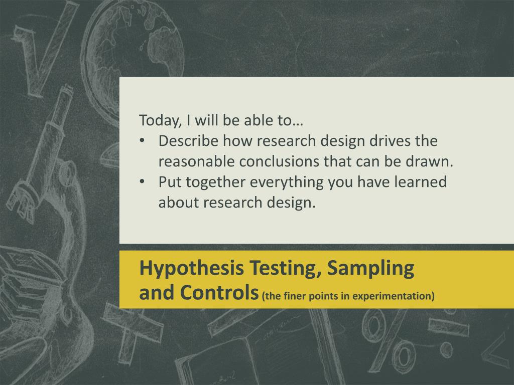 Hypothesis Testing, Samplingand Controls (the finer points in experimentation) Today, I will be able to… Describe how research design drives the reasonable conclusions that can be drawn. Put together everything you have learned about research design.