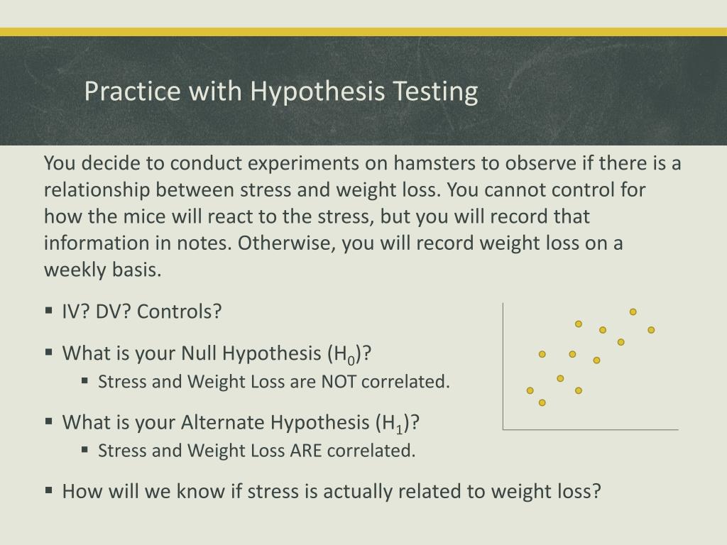 Practice with Hypothesis Testing You decide to conduct experiments on hamsters to observe if there is a relationship between stress and weight loss. You cannot control for how the mice will react to the stress, but you will record that information in notes. Otherwise, you will record weight loss on a weekly basis. • IV? DV? Controls? • What is your Null Hypothesis (H0)? • Stress and Weight Loss are NOT correlated. • What is your Alternate Hypothesis (H1)? • Stress and Weight Loss ARE correlated. • How will we know if stress is actually related to weight loss?
