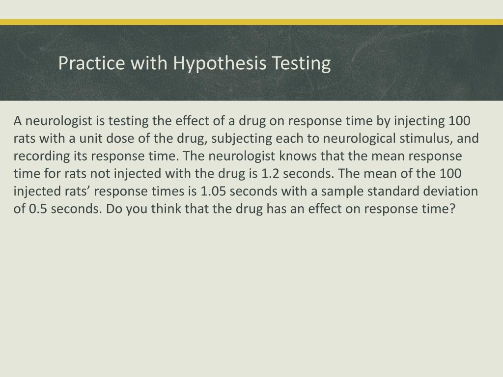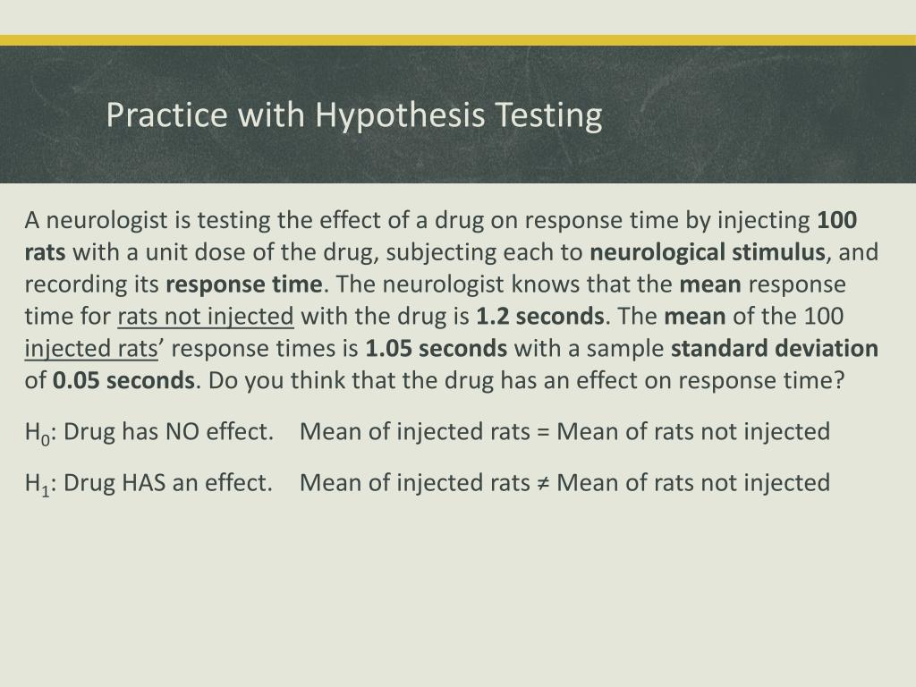 Practice with Hypothesis Testing A neurologist is testing the effect of a drug on response time by injecting 100 rats with a unit dose of the drug, subjecting each to neurological stimulus, and recording its response time. The neurologist knows that the mean response time for rats not injected with the drug is 1.2 seconds. The mean of the 100 injected rats’ response times is 1.05 seconds with a sample standard deviation of 0.5 seconds. Do you think that the drug has an effect on response time?