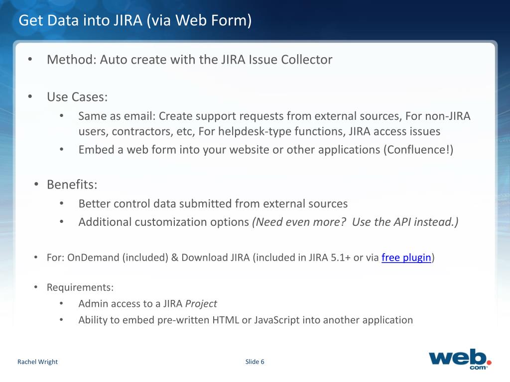 Get Data into JIRA (via Web Form) Rachel Wright