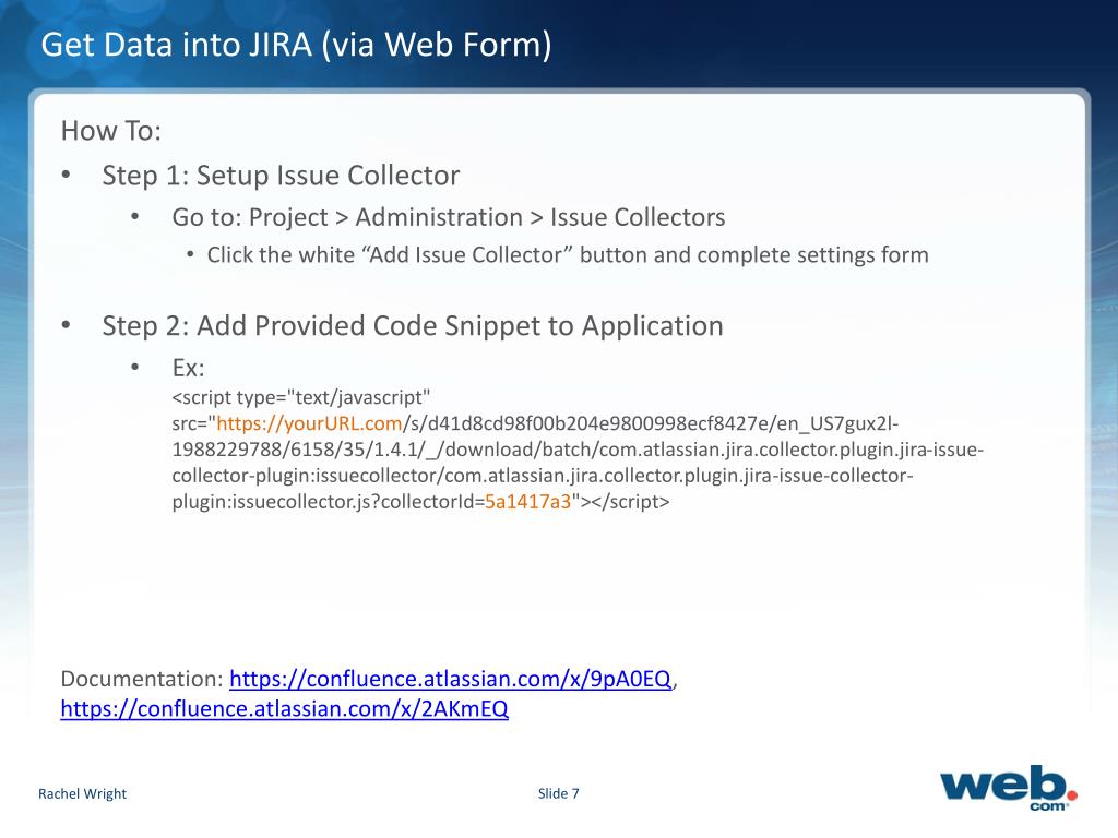 Get Data into JIRA (via Web Form) How To: • Step 1: Setup Issue Collector • Go to: Project > Administration > Issue Collectors • Click the white “Add Issue Collector” button and complete settings form • Step 2: Add Provided Code Snippet to Application • Ex: <script type="text/javascript" src="https://yourURL.com/s/d41d8cd98f00b204e9800998ecf8427e/en_US7gux2l-1988229788/6158/35/1.4.1/_/download/batch/com.atlassian.jira.collector.plugin.jira-issue-collector-plugin:issuecollector/com.atlassian.jira.collector.plugin.jira-issue-collector-plugin:issuecollector.js?collectorId=5a1417a3"></script> Documentation: https://confluence.atlassian.com/x/9pA0EQ, https://confluence.atlassian.com/x/2AKmEQ Rachel Wright