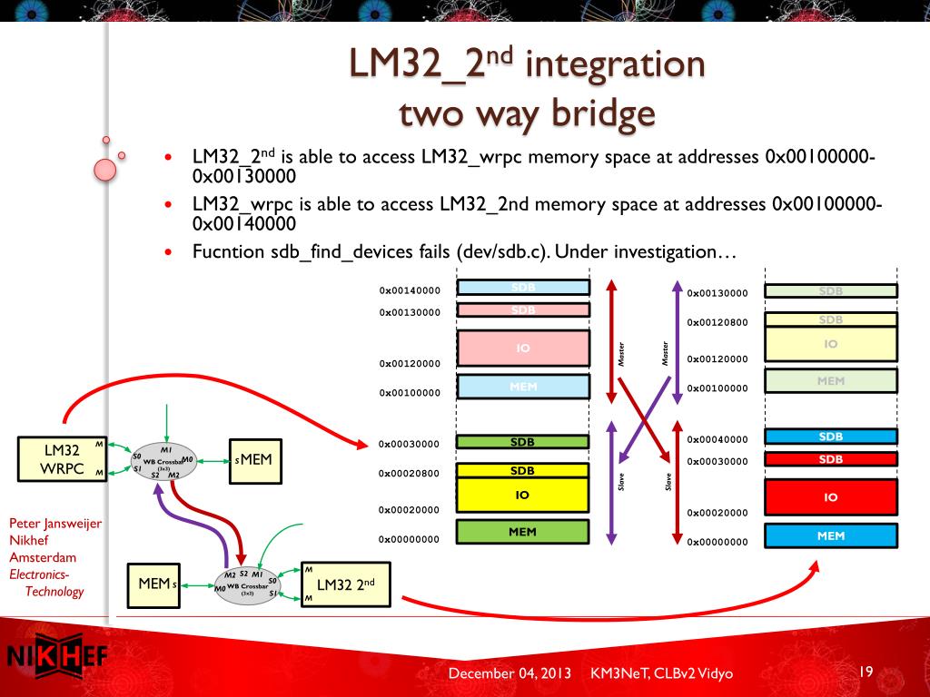 LM32_2nd integrationtwo way bridge • LM32_2nd is able to access LM32_wrpc memory space at addresses 0x00100000-0x00130000 • LM32_wrpc is able to access LM32_2nd memory space at addresses 0x00100000-0x00140000 • Fucntionsdb_find_devices fails (dev/sdb.c). Under investigation… 0x00140000 SDB 0x00130000 SDB 0x00130000 SDB MEM 0x00120800 SDB S IO IO Master Master 0x00120000 0x00120000 M MEM MEM 0x00100000 0x00100000 LM32 WRPC M M1 S0 M0 S1 S2 M2 0x00040000 SDB 0x00030000 SDB 0x00030000 SDB 0x00020800 SDB Slave Slave IO IO WB Crossbar (3x3) WB Crossbar (3x3) 0x00020000 M M1 M2 0x00020000 LM32 2nd S0 MEM S2 S M0 S1 MEM MEM M 0x00000000 0x00000000