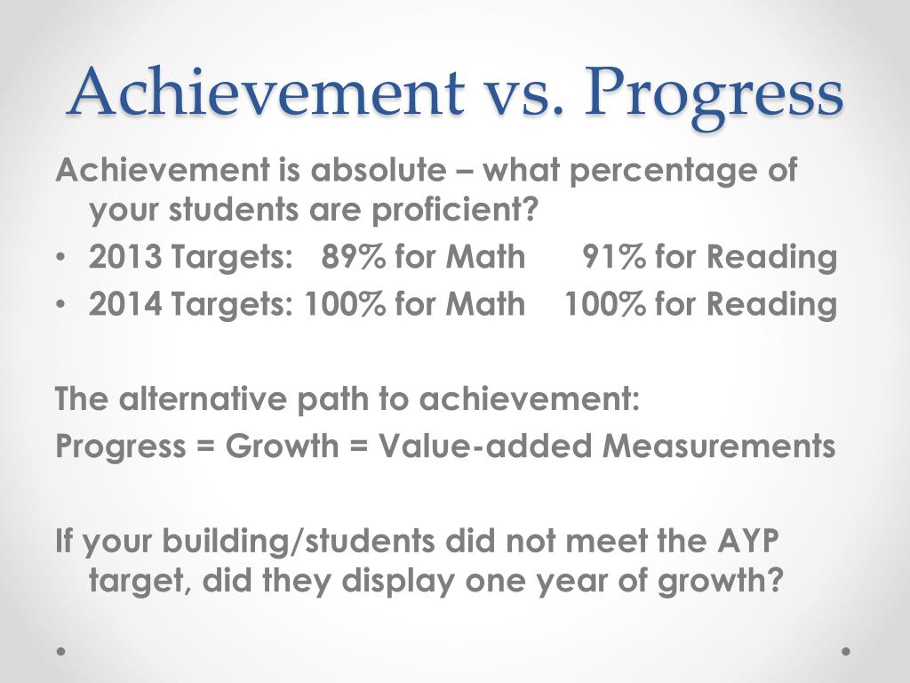 Achievement vs. Progress Achievement is absolute – what percentage of your students are proficient? • 2013 Targets: 89% for Math 91% for Reading • 2014 Targets: 100% for Math 100% for Reading The alternative path to achievement: Progress = Growth = Value-added Measurements If your building/students did not meet the AYP target, did they display one year of growth?