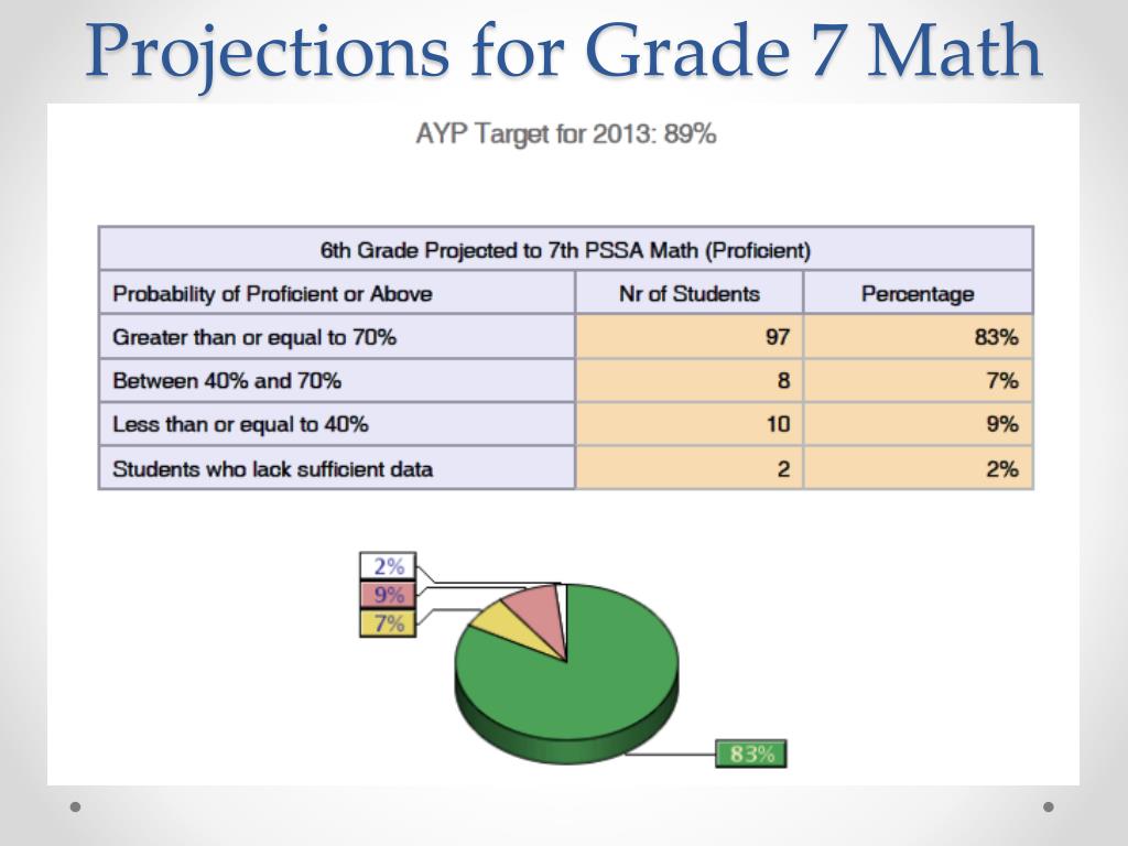 This year’s AYP Math target increases from 78% to 89% Subgroups can be selected for further analysis (special ed, economically disadvantaged) In this chart, 83% of this year’s 7th grade is predicted to be proficient if they receive one year of growth. Step 5: Clicking on the underlined numbers will bring up the names of students in each category.