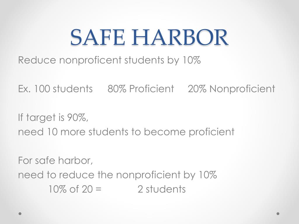 SAFE HARBOR Reduce nonproficent students by 10% Ex. 100 students 80% Proficient 20% Nonproficient If target is 90%, need 10 more students to become proficient For safe harbor, need to reduce the nonproficientby 10% 10% of 20 = 2 students