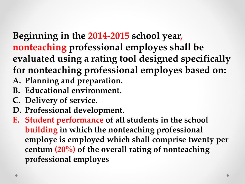 Beginning in the 2014-2015 school year, nonteaching professional employes shall be evaluated using a rating tool designed specifically for nonteaching professional employes based on: Planning and preparation. Educational environment. Delivery of service. Professional development. Student performance of all students in the school building in which the nonteaching professional employe is employed which shall comprise twenty per centum (20%) of the overall rating of nonteaching professional employes