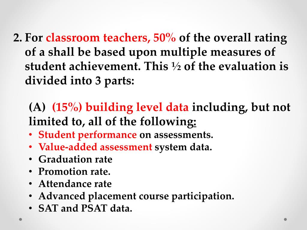 2. For classroom teachers, 50% of the overall rating of ashall be based upon multiple measures of student achievement. This ½ of the evaluation is divided into 3 parts: • (A) (15%) building level data including, but not limited to, all of the following: • Student performance on assessments. • Value-added assessment system data. • Graduation rate • Promotion rate. • Attendance rate • Advanced placement course participation. • SAT and PSAT data.