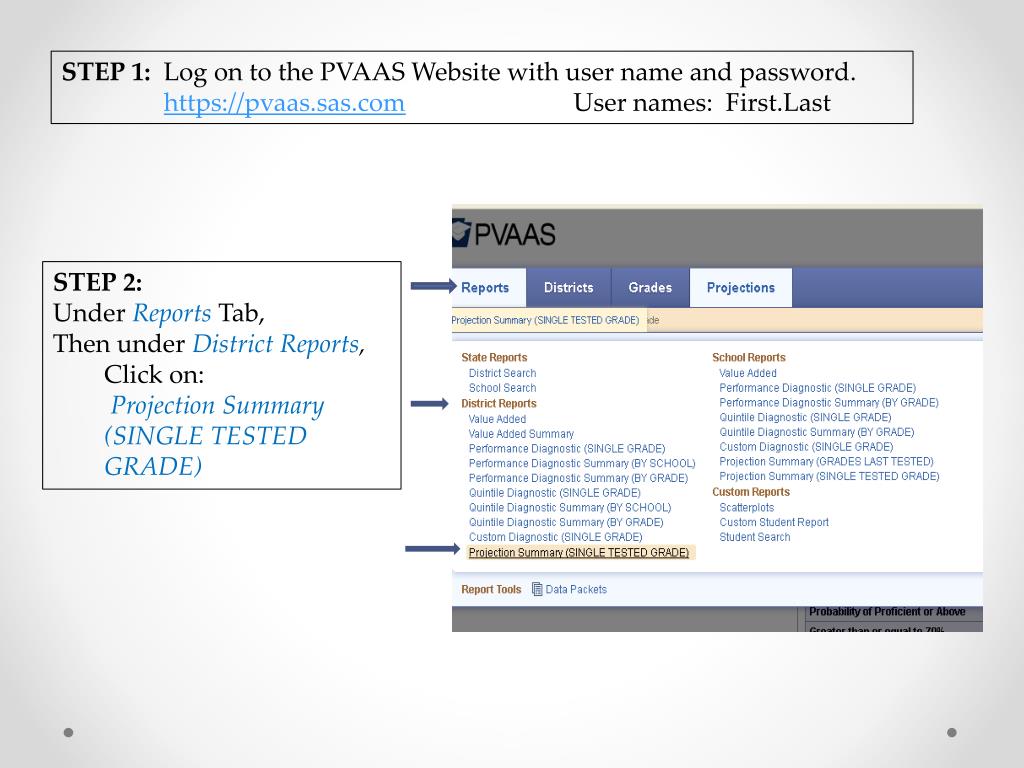 STEP 1: Log on to the PVAAS Website with user name and password. • https://pvaas.sas.com User names: First.Last • STEP 2: • Under Reports Tab, • Then under District Reports, • Click on: • Projection Summary (SINGLE TESTED GRADE)