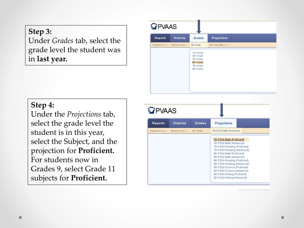 Step 3: Under Grades tab, select the grade level the student was in last year. Step 4: Under the Projections tab, select the grade level the student is in this year, select the Subject, and the projection for Proficient. For students now in Grades 9, select Grade 11 subjects for Proficient.