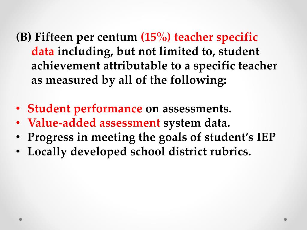 Fifteen per centum (15%) teacher specific data including, but not limited to, student achievement attributable to a specific teacher as measured by all of the following: • Student performance on assessments. • Value-added assessment system data. • Progress in meeting the goals of student’s IEP • Locally developed school district rubrics.