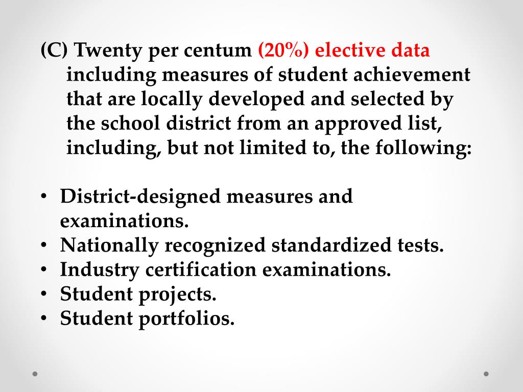 Twenty per centum (20%) elective data including measures of student achievement that are locally developed and selected by the school district from an approved list, including, but not limited to, the following: • District-designed measures and examinations. • Nationally recognized standardized tests. • Industry certification examinations. • Student projects. • Student portfolios.