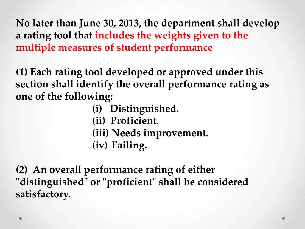 No later than June 30, 2013, the department shall develop a rating tool that includes the weights given to the multiple measures of student performance • (1) Each rating tool developed or approved under this section shall identify the overall performance rating as one of the following: • (i) Distinguished. • (ii) Proficient. • (iii) Needs improvement. • Failing. • (2) An overall performance rating of either "distinguished" or "proficient" shall be considered satisfactory.