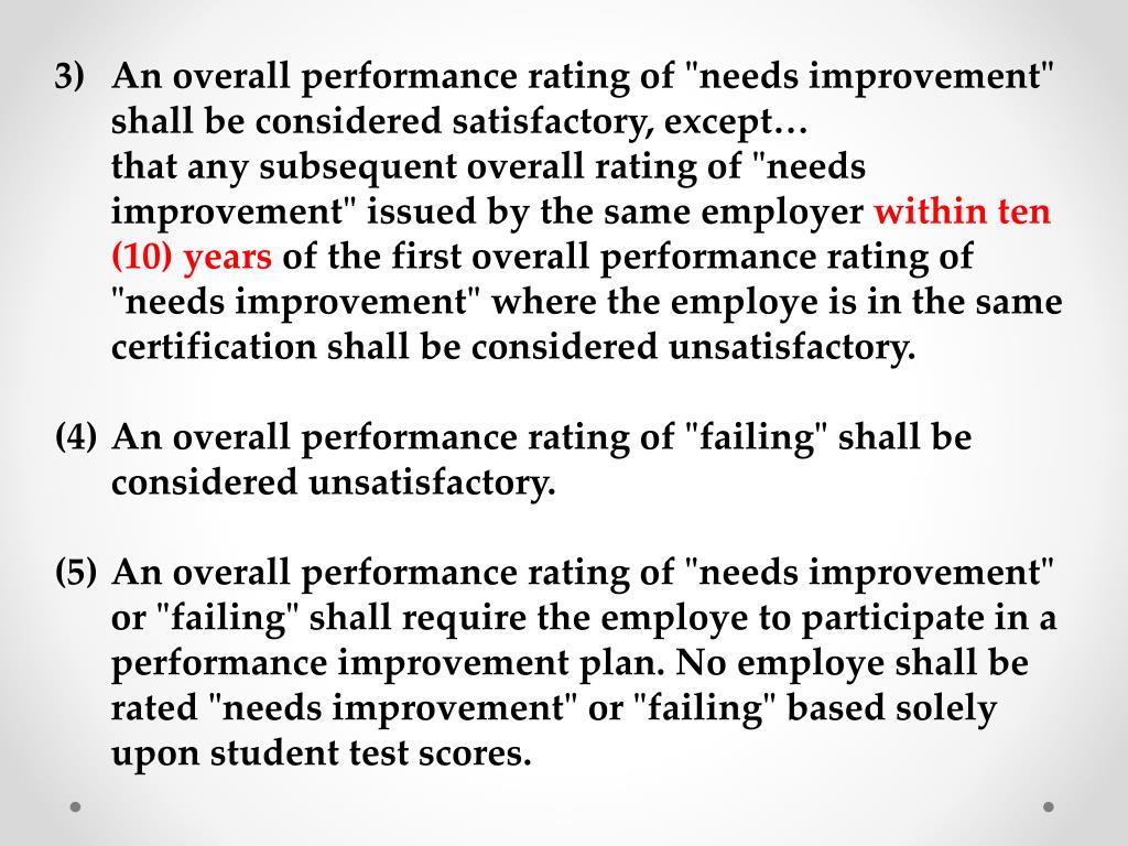 An overall performance rating of "needs improvement" shall be considered satisfactory, except… • that any subsequent overall rating of "needs improvement" issued by the same employer within ten (10) years of the first overall performance rating of "needs improvement" where the employe is in the same certification shall be considered unsatisfactory. • An overall performance rating of "failing" shall be considered unsatisfactory. • An overall performance rating of "needs improvement" or "failing" shall require the employe to participate in a performance improvement plan. No employe shall be rated "needs improvement" or "failing" based solely upon student test scores.