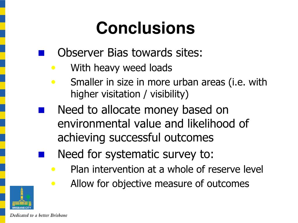 Conclusions • Observer Bias towards sites: • With heavy weed loads • Smaller in size in more urban areas (i.e. with higher visitation / visibility) • Need to allocate money based on environmental value and likelihood of achieving successful outcomes • Need for systematic survey to: • Plan intervention at a whole of reserve level • Allow for objective measure of outcomes
