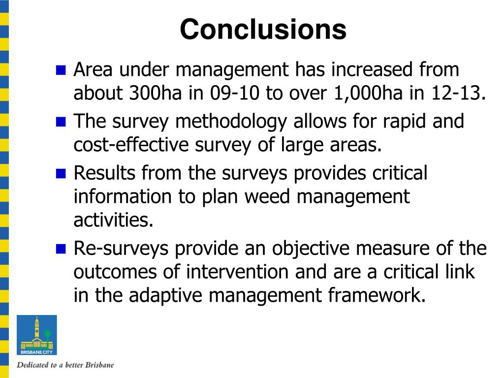 Conclusions • Area under management has increased from about 300ha in 09-10 to over 1,000ha in 12-13. • The survey methodology allows for rapid and cost-effective survey of large areas. • Results from the surveys provides critical information to plan weed management activities. • Re-surveys provide an objective measure of the outcomes of intervention and are a critical link in the adaptive management framework.