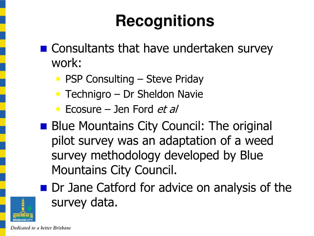Recognitions • Consultants that have undertaken survey work: • PSP Consulting – Steve Priday • Technigro – Dr Sheldon Navie • Ecosure – Jen Ford et al • Blue Mountains City Council: The original pilot survey was an adaptation of a weed survey methodology developed by Blue Mountains City Council. • Dr Jane Catford for advice on analysis of the survey data.