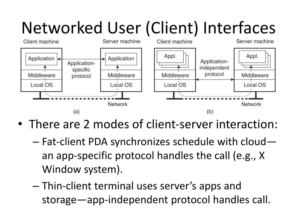 Networked User (Client) Interfaces • There are 2 modes of client-server interaction: • Fat-client PDA synchronizes schedule with cloud—an app-specific protocol handles the call (e.g., X Window system). • Thin-client terminal uses server’s apps and storage—app-independent protocol handles call.