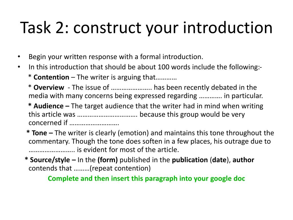 Task 2: construct your introduction • Begin your written response with a formal introduction. • In this introduction that should be about 100 words include the following:- * Contention – The writer is arguing that………… * Overview - The issue of ………………….. has been recently debated in the media with many concerns being expressed regarding …………. in particular. * Audience – The target audience that the writer had in mind when writing this article was ……………………………. because this group would be very concerned if ………………………. * Tone – The writer is clearly (emotion) and maintains this tone throughout the commentary. Though the tone does soften in a few places, his outrage due to …………………….. is evident for most of the article. * Source/style – In the (form) published in the publication (date), author contends that ………(repeat contention) Complete and then insert this paragraph into your google doc
