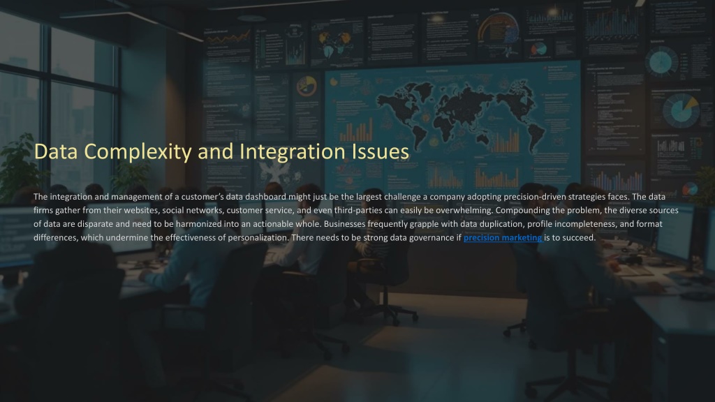 Data Complexity and Integration Issues The integration and management of a customer’s data dashboard might just be the largest challenge a company adopting precision-driven strategies faces. The data firms gather from their websites, social networks, customer service, and even third-parties can easily be overwhelming. Compounding the problem, the diverse sources of data are disparate and need to be harmonized into an actionable whole. Businesses frequently grapple with data duplication, profile incompleteness, and format differences, which undermine the effectiveness of personalization. There needs to be strong data governance if precision marketing is to succeed.