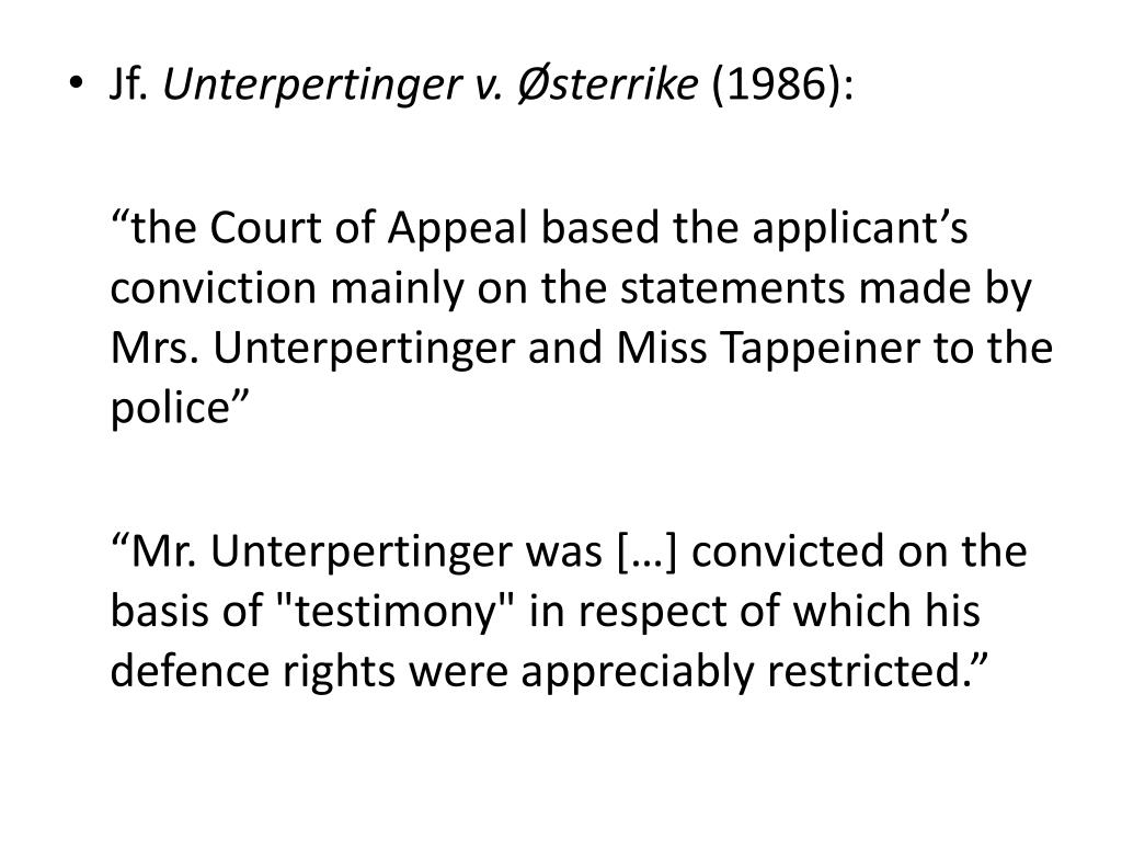 Jf. Unterpertinger v. Østerrike (1986): “the Court of Appeal based the applicant’s conviction mainly on the statements made by Mrs. Unterpertinger and Miss Tappeiner to the police” “Mr. Unterpertinger was […] convicted on the basis of "testimony" in respect of which his defence rights were appreciably restricted.”